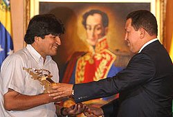 Evo Morales (à g.) et Hugo Chavez: alliance "bolivarienne" devant le portrait de Bolivar Archives - Photo Quisaira Guevara - Prensa Presidencial (Caracas) |